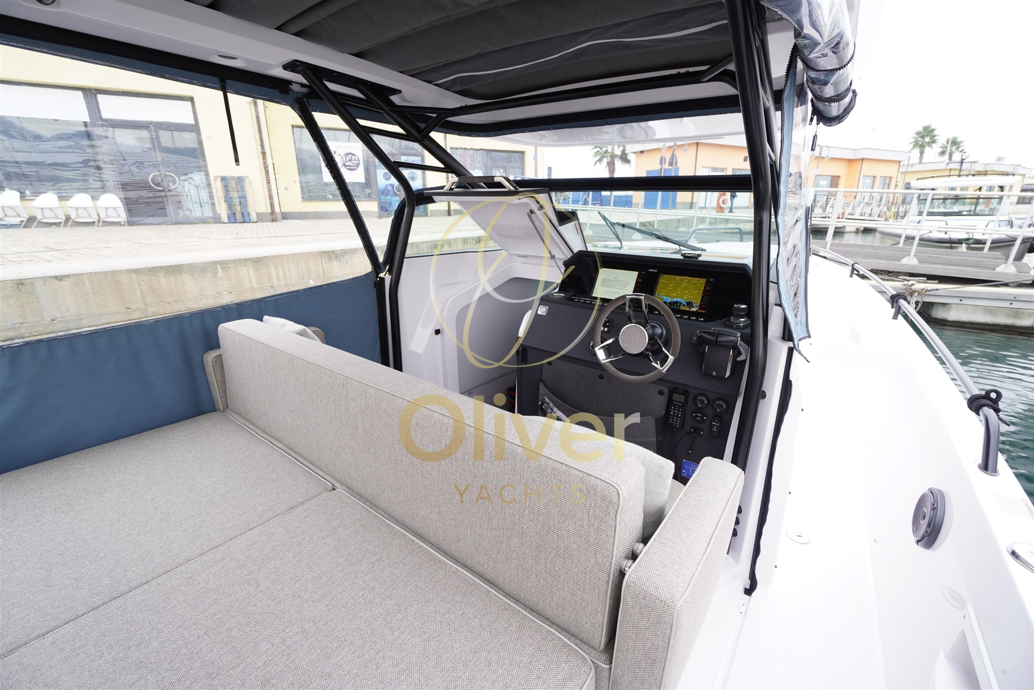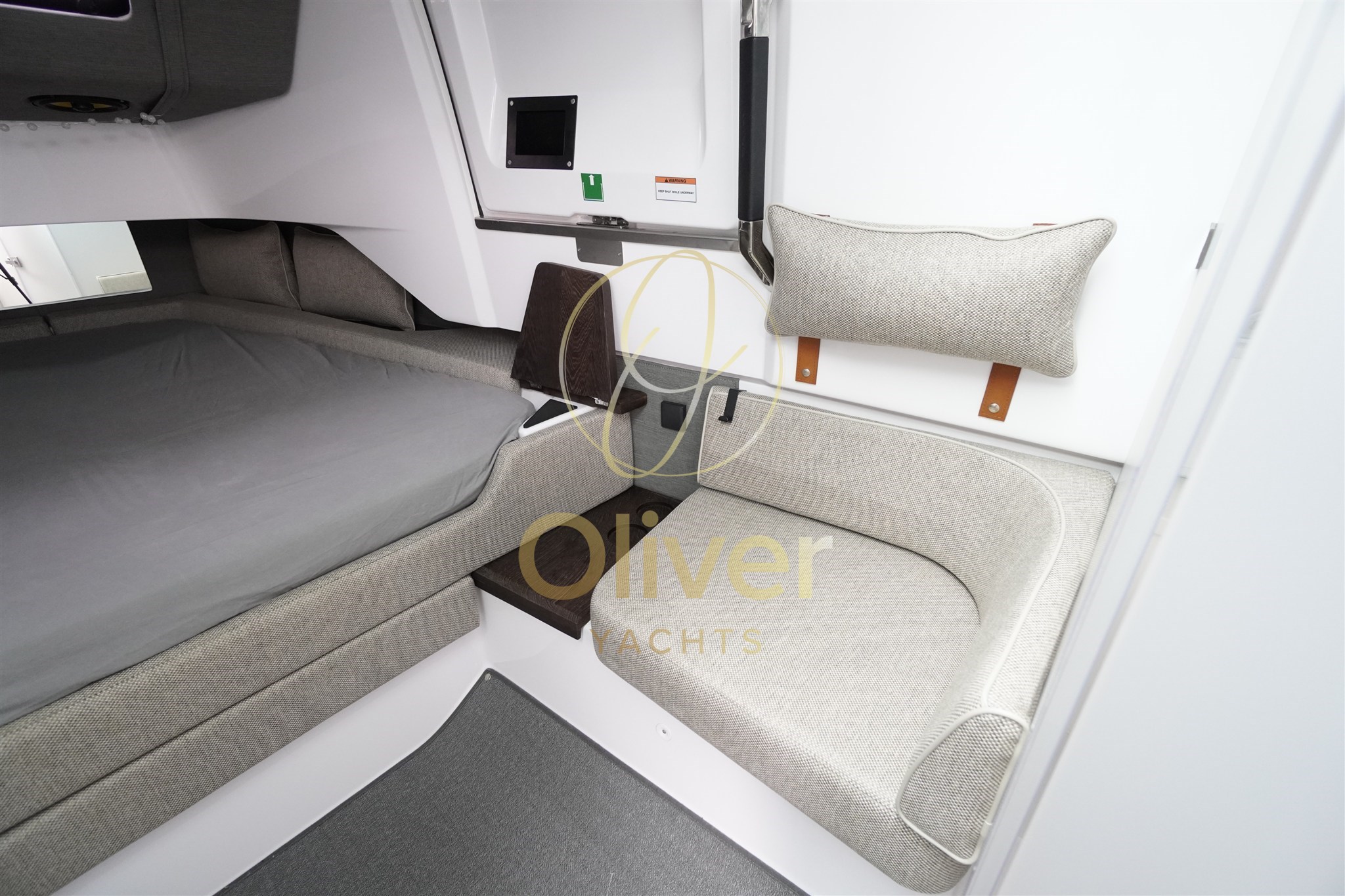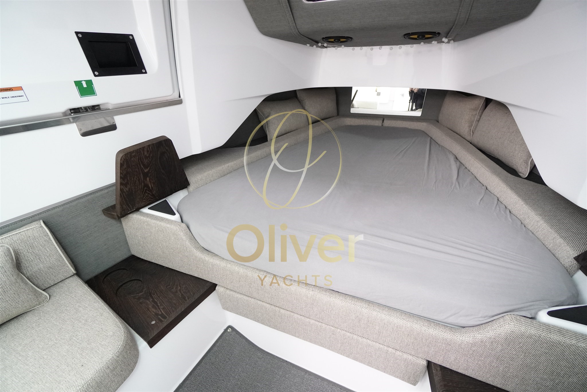 Lo spazio è sorprendentemente generoso per un day-boat di questa categoria: la cuccetta matrimoniale offre posto per due persone e permette un utilizzo pratico anche per overnight occasionali. L’ambiente risulta luminoso grazie alle aperture laterali e ai materiali selezionati, che migliorano la percezione dello spazio e mantengono una sensazione premium a bordo.