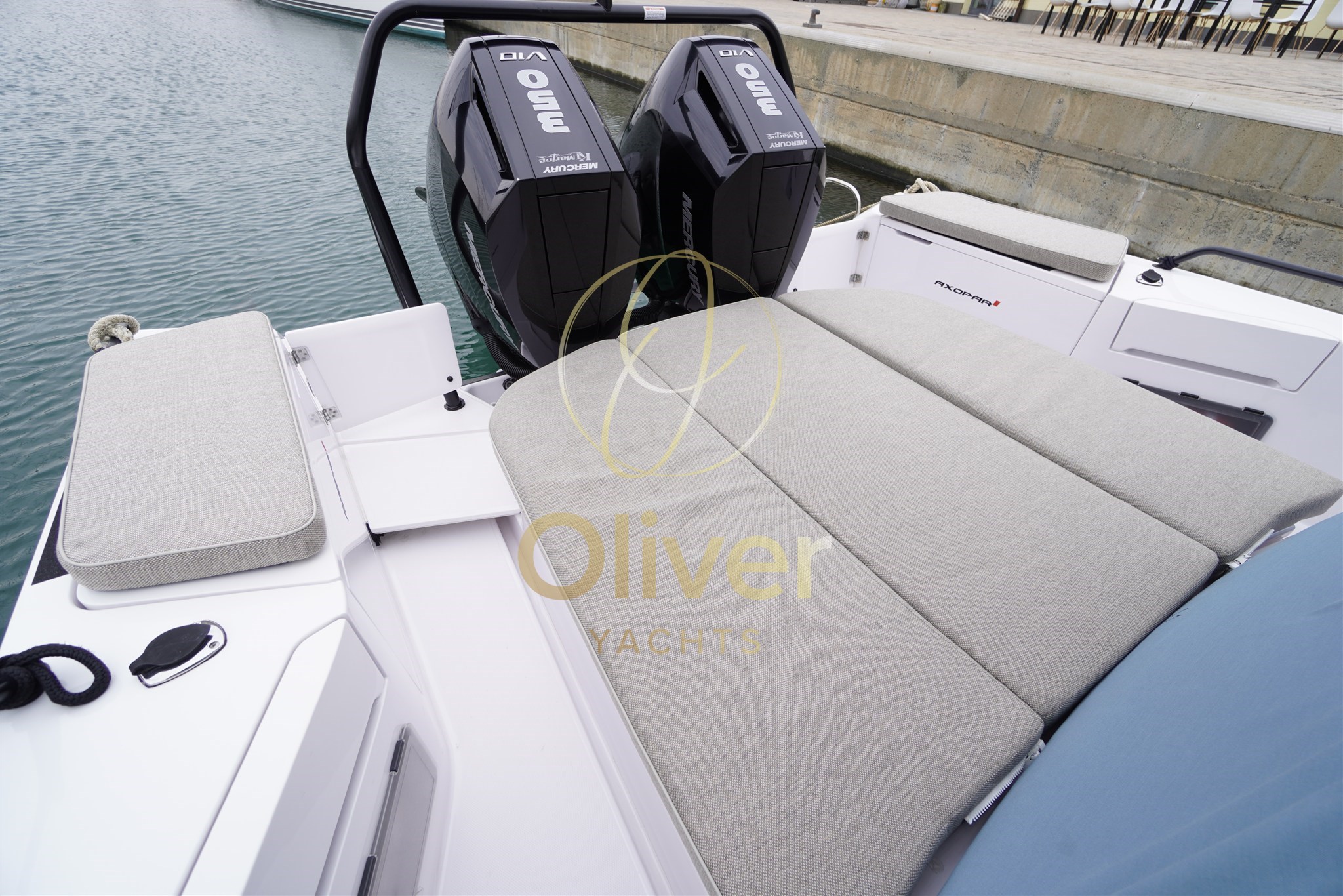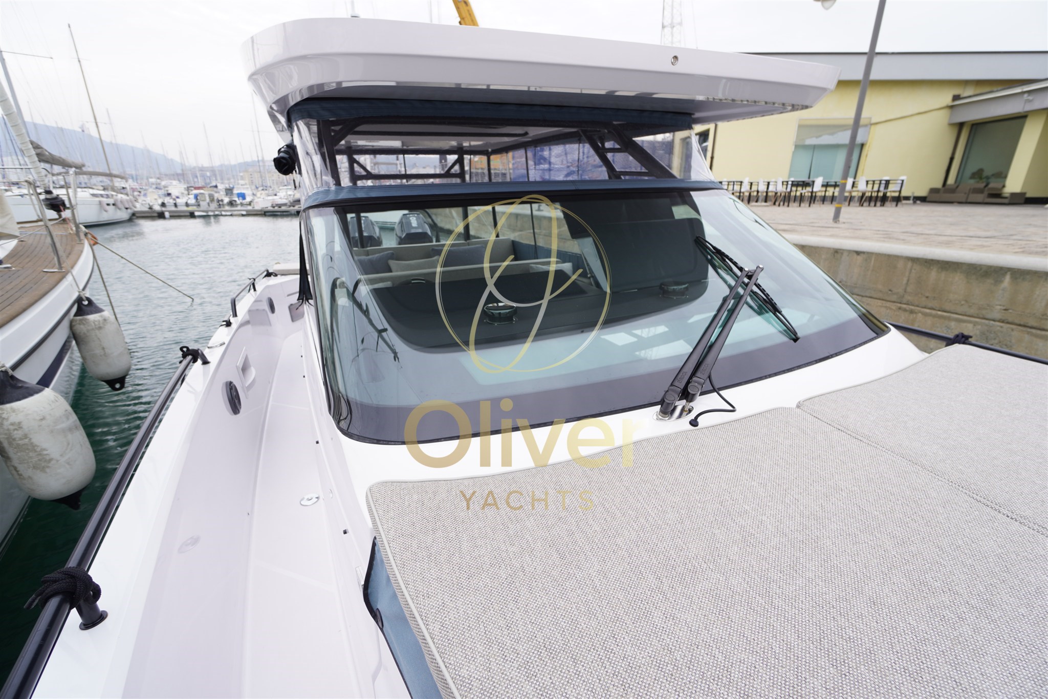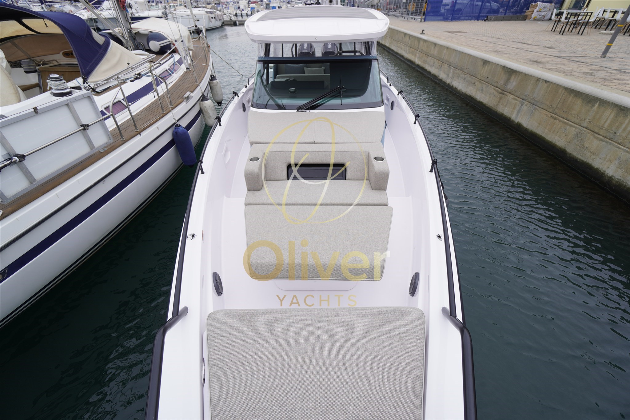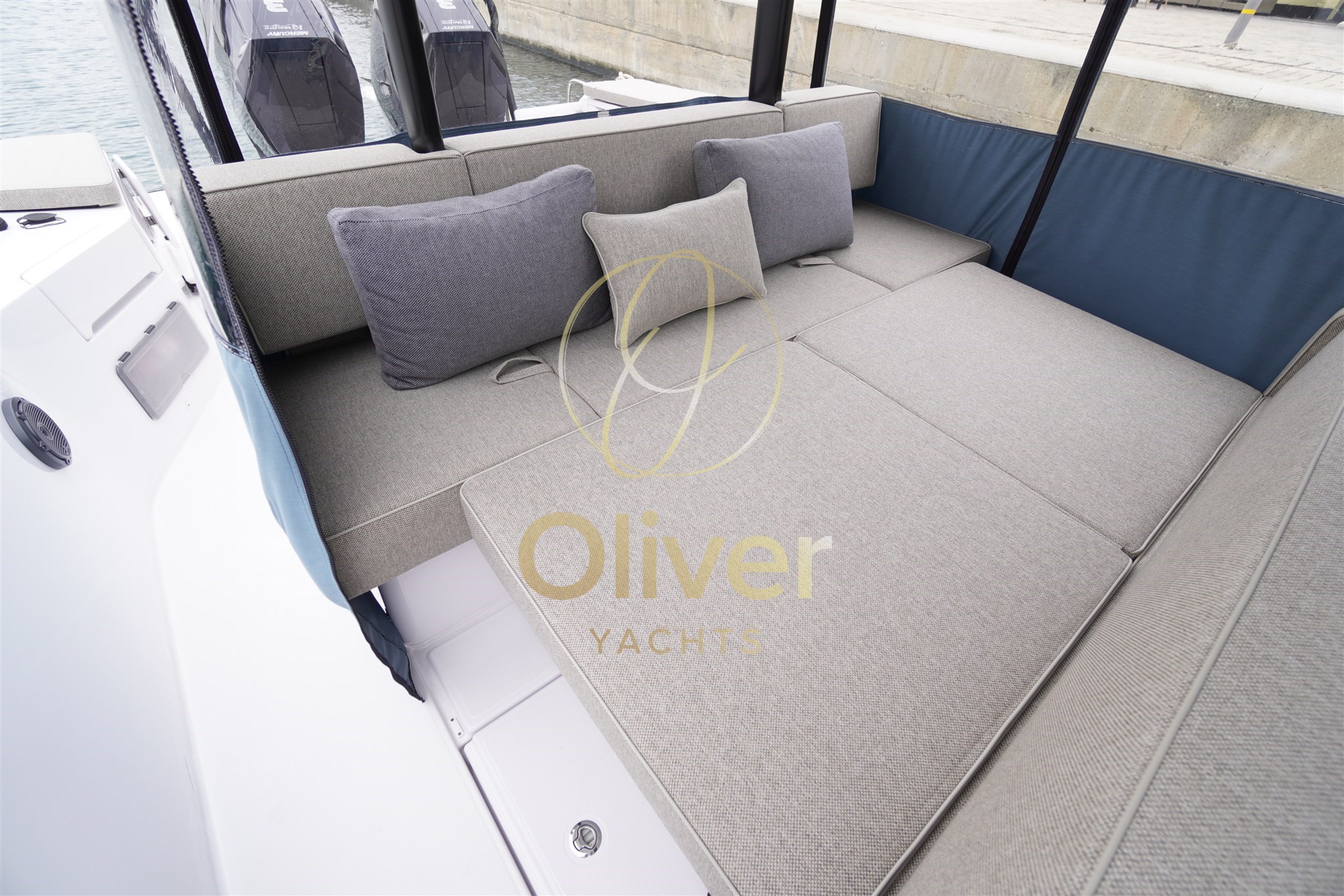 Lo spazio è sorprendentemente generoso per un day-boat di questa categoria: la cuccetta matrimoniale offre posto per due persone e permette un utilizzo pratico anche per overnight occasionali. L’ambiente risulta luminoso grazie alle aperture laterali e ai materiali selezionati, che migliorano la percezione dello spazio e mantengono una sensazione premium a bordo.