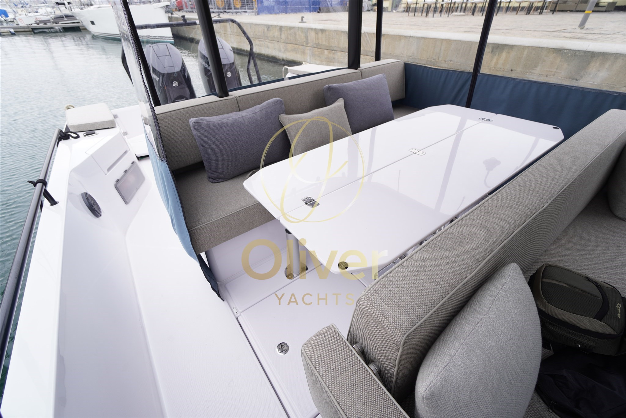 Il layout è pensato per un utilizzo intensivo: aree lounge a prua, cockpit modulare, postazione di guida ergonomica con strumentazione Simrad. Sotto coperta trovi una cabina completa e funzionale, perfetta per riposare o gestire pernottamenti occasionali.