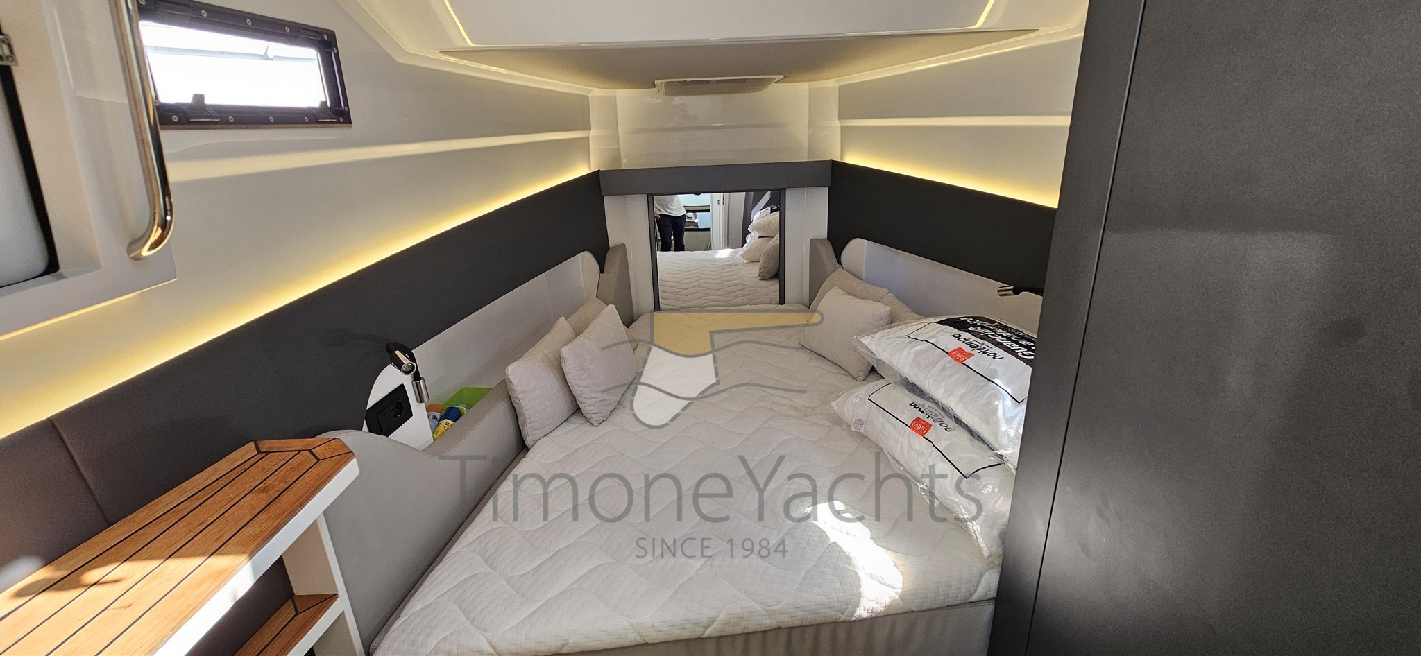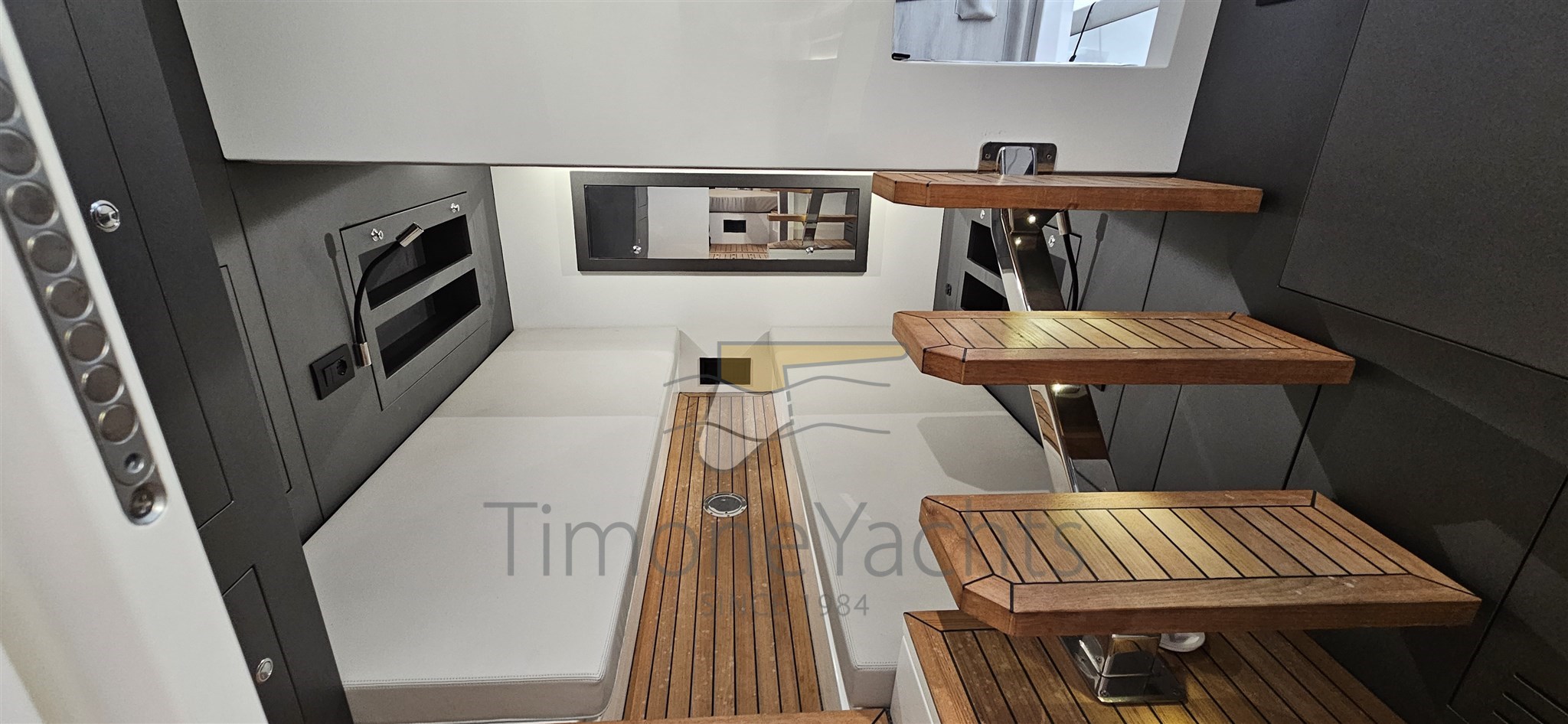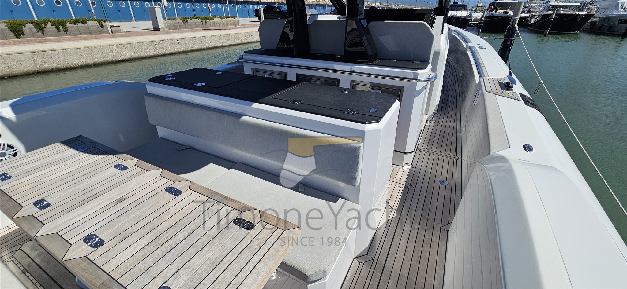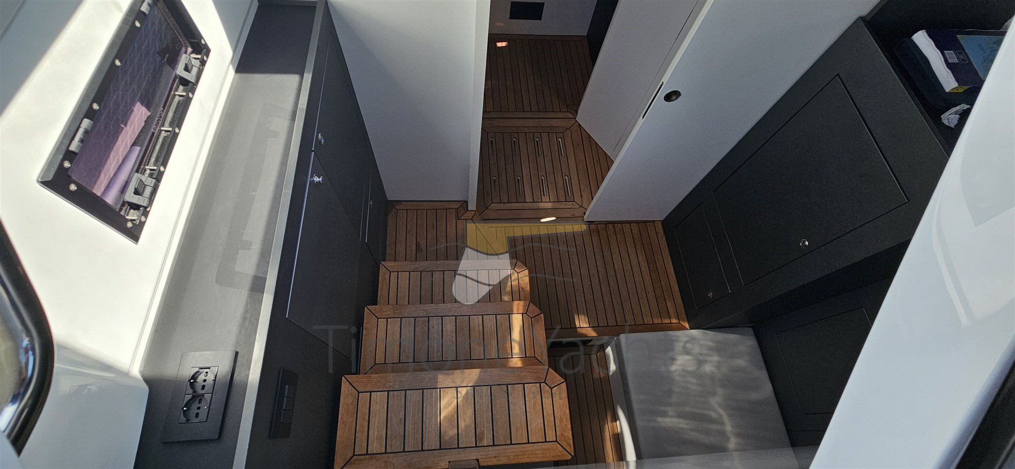 L’ampio prendisole di poppa offre comfort e sicurezza per chi desidera vivere il mare a pieno. Il pozzetto, personalizzabile secondo le esigenze dell’armatore, è ideale per accogliere numerosi ospiti con la massima comodità. Ogni dettaglio è studiato per massimizzare il comfort e la praticità a bordo.