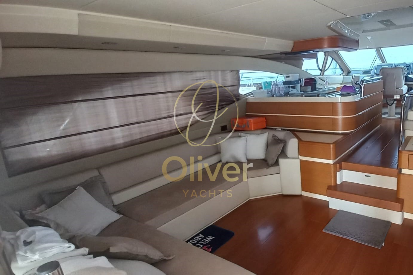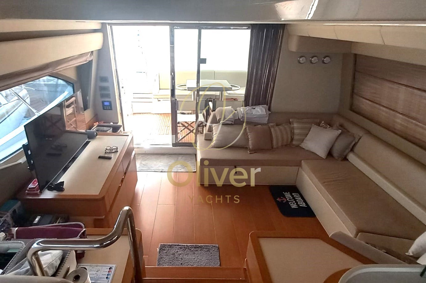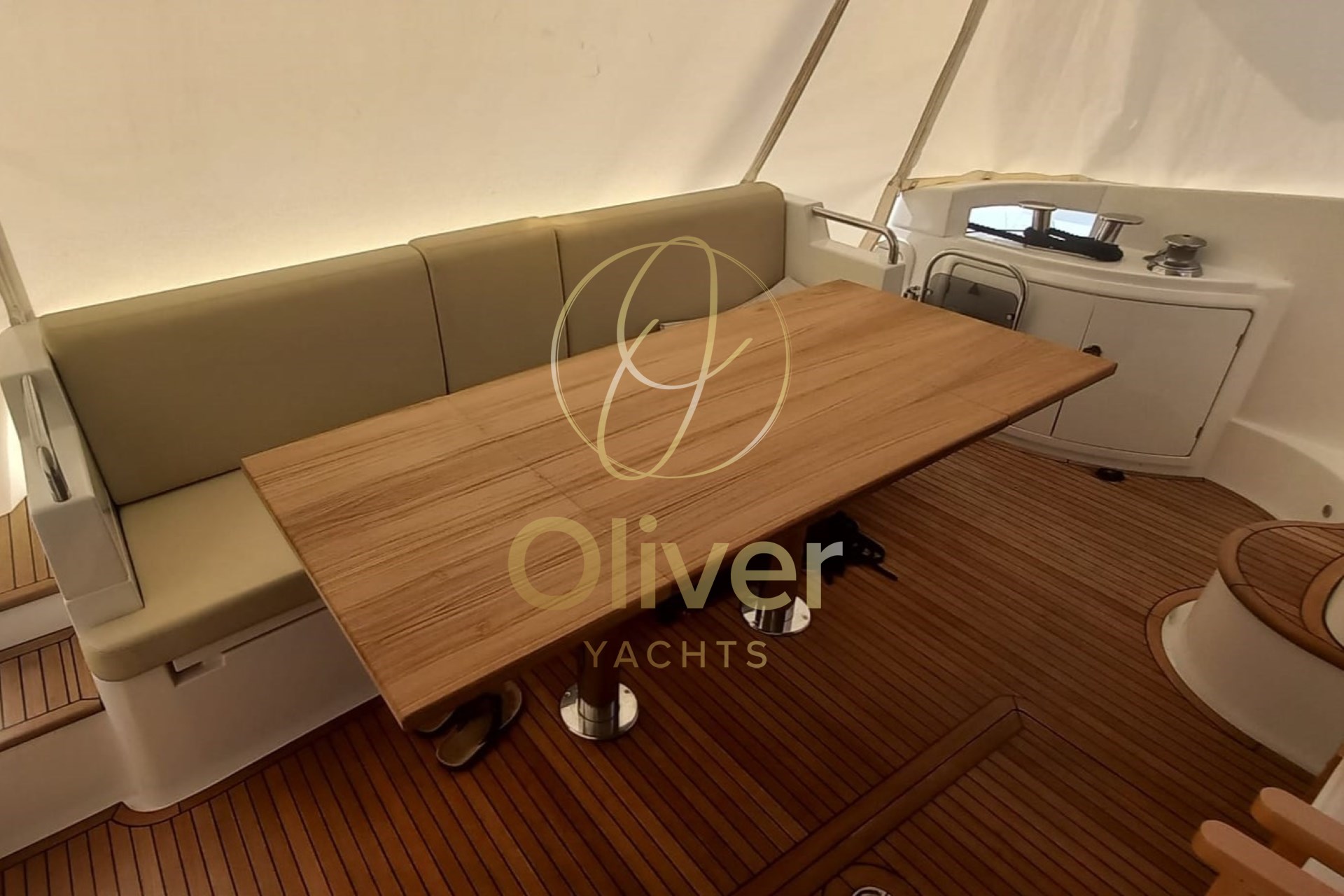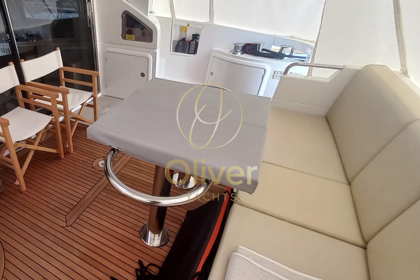Appena saliti a bordo, si percepisce immediatamente l’eleganza e l’equilibrio degli spazi. Il grande pozzetto di poppa accoglie gli ospiti in una zona living all’aperto, protetta e confortevole, perfetta per cene e momenti di relax. Entrando nel salone, si apre un ambiente moderno e luminoso, con ampie vetrate laterali che inondano l’interno di luce naturale e offrono una vista continua sul mare.