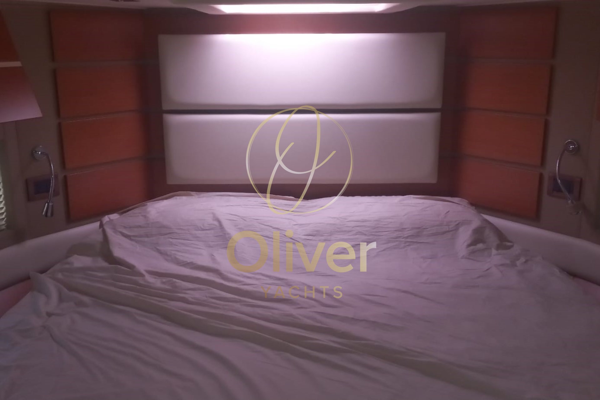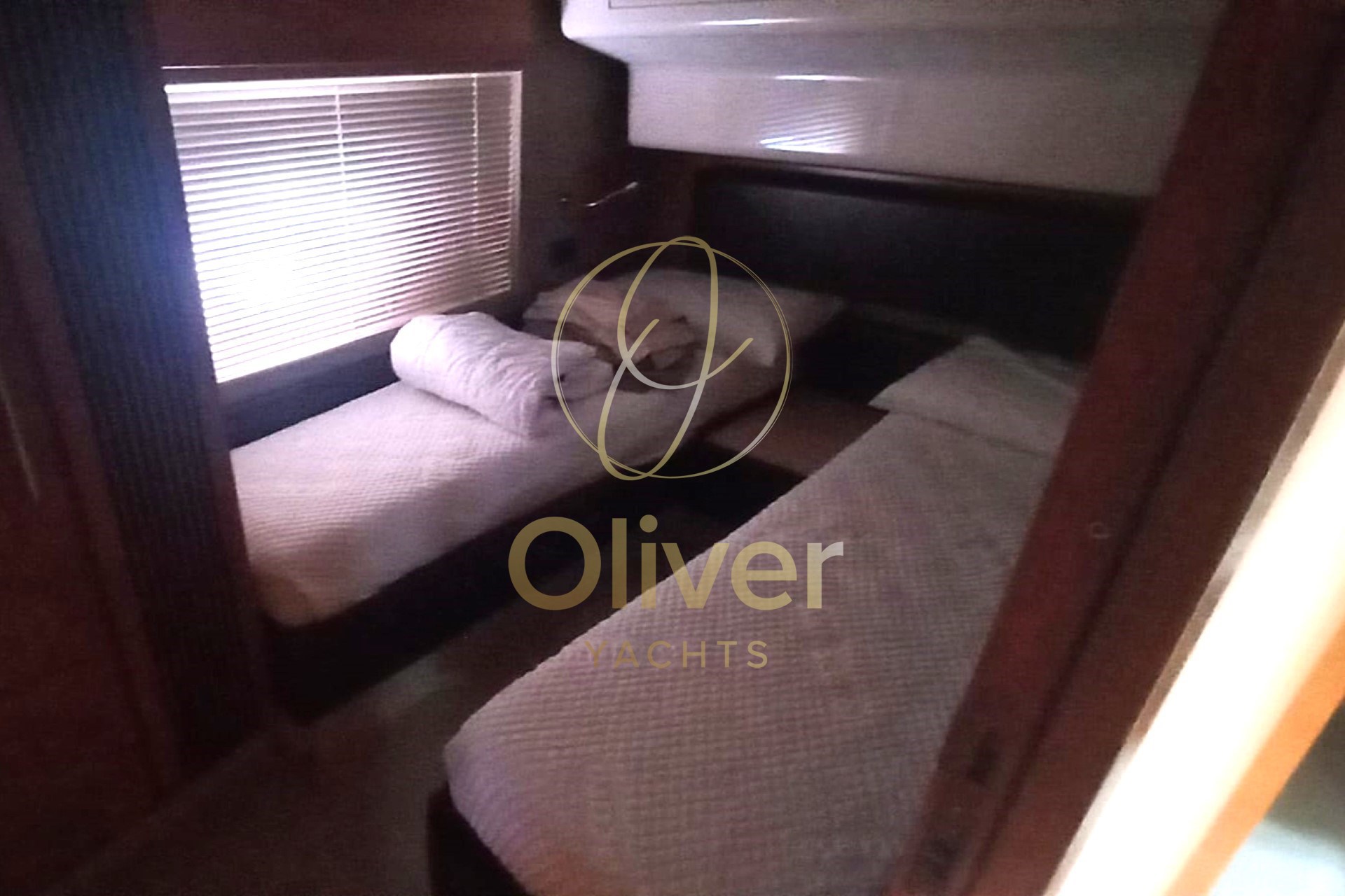Scendendo al ponte inferiore, si accede alla zona notte composta da tre cabine eleganti. La cabina armatoriale si estende per tutta la larghezza dello scafo, con un bagno privato ensuite, arredi raffinati e ampi spazi per lo stivaggio. La cabina VIP a prua è altrettanto luminosa e accogliente, anch’essa dotata di bagno ensuite. La terza cabina ospiti con letti singoli è servita da un bagno completo.